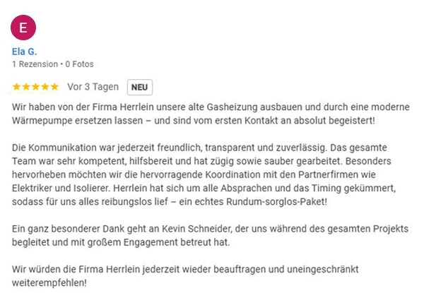 „Die Firma Herrlein hat im Frühjahr 2024 in unserem Einfamilienhaus den Heizungstausch von einer Gasanlage auf eine Wärmepumpe geplant und durchgeführt und wir sind sehr zufrieden. Die Installation verlief problemlos, termingerecht und wurde …weiterlesenFeedback: M. Suda
